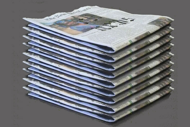 Every day, a fresh copy of The New York Times with the words "old news" cut onto it is delivered to the gallery, a stack accumulating over the course of the exhibition." data-attachment-id="2157" data-rel="lightbox" title="Old News, 2009. Laser cut paper, accumulating stack, table. 20 x 18 x 18 inches.